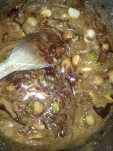 Add the finely chopped onions to the oil over a low to medium heat and cook until dark brown. (can take a good half an hour but so worth it).